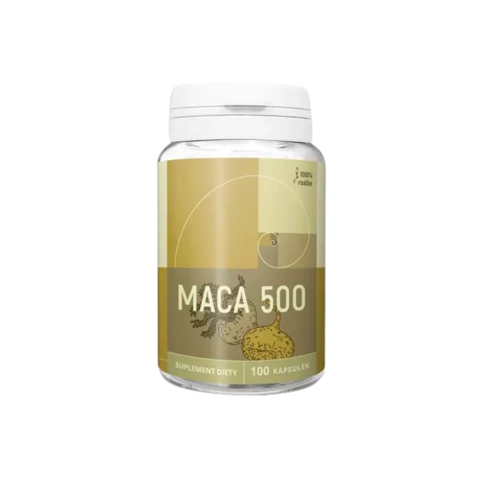 500 mg mielony korzeń Maca (Lepidium meyenii), kapsułka celulozowa.