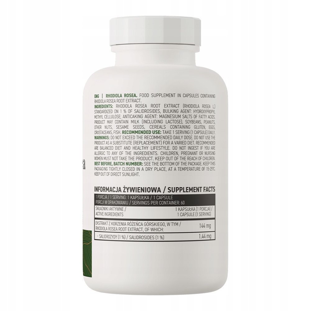 - Źródło ekstraktu z różeńca górskiego - jedna porcja suplementu diety dostarcza do organizmu 144 mg ekstraktu z różeńca górskiego standaryzowanego na 1% salidrozydów.